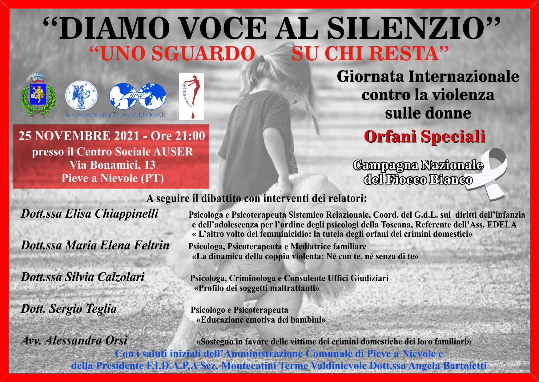 25 novembre - Giornata Internazionale contro la violenza sulle donne: "Diamo voce al silenzio", ore 21,00 Centro Auser, in collaborazione con F.I.D.A.P.A
