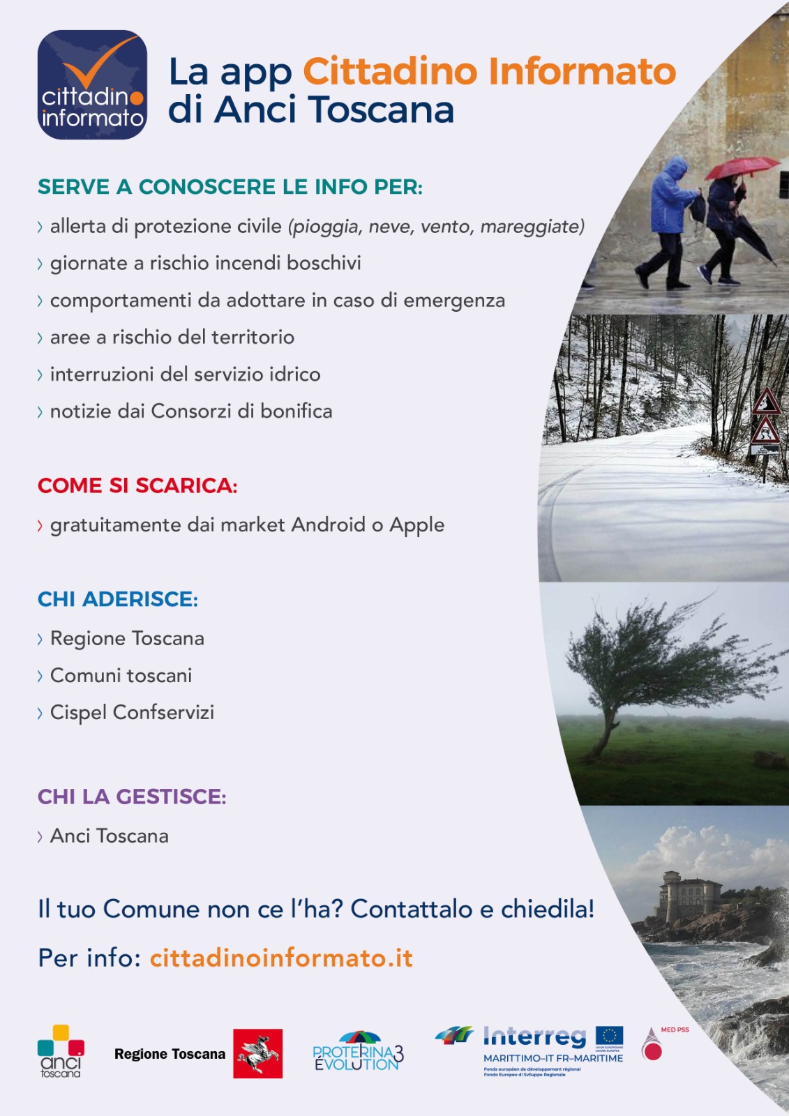Frutto della collaborazione tra Regione Toscana e Anci Toscana, oltre agli stati di allerta fornisce informazioni su aree a rischio e zone sicure da raggiungere in caso di calamità naturale, oltre che su i comportamenti da tenere per ogni tipologia di rischio, oltre ad altri servizi ed informazioni.