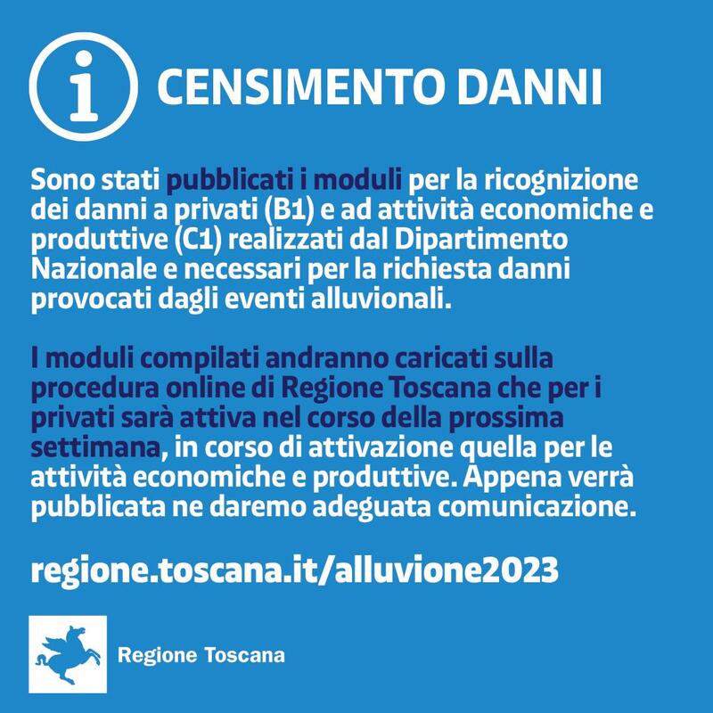 Sono stati pubblicati sul sito della Regione Toscana all’indirizzo www.regione.toscana.it/alluvione2023 i moduli per la ricognizione dei danni a privati (B1) e ad attività economiche e produttive (C1) realizzati dal Dipartimento Nazionale e necessari per la richiesta danni provocati dagli eventi alluvionali.