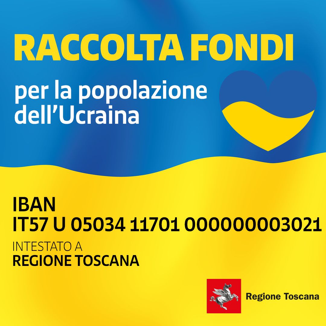 Chiunque può effettuare una donazione attraverso l’IBAN IT57 U 05034 11701 000000003021 intestato a Regione Toscana causale Emergenza Ucraina ??