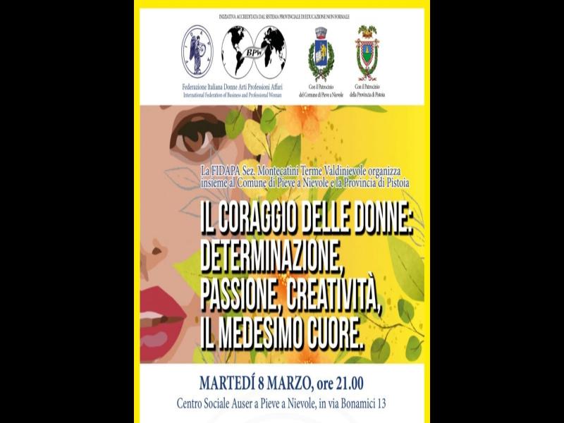 Presentata stamani con una conferenza stampa l'iniziativa "Il coraggio delle donne: determinazione, passione, creatività, il medesimo cuore". Ospite centrale della serata sarà Nicole Orlando, atleta paralimpica, anche autrice del libro Vietato dire non ce la faccio. L'appuntamento è per domani martedì 8 marzo ore 21.00 al Centro sociale AUSER di Pieve a Nievole.