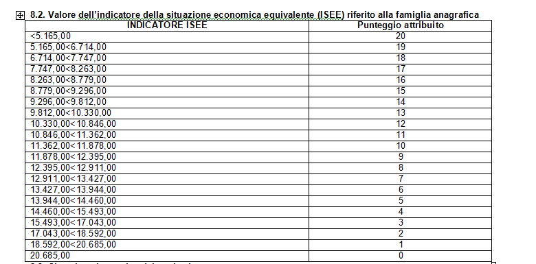 Il punteggio verrà assegnato con i parametri della tabella A, solo ed esclusivamente se l’attestazione ISEE in corso di validità sarà allegata alla domanda di ammissione al momento della presentazione o consegnata all’Ufficio P.I. ENTRO E NON OLTRE LA DATA DI SCADENZA DEL BANDO.