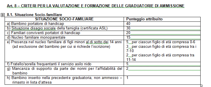 - Qualora il numero delle domande di ammissione superi il numero dei posti disponibili, si provvederà alla predisposizione di una graduatoria di accesso divisa per età: - gruppo piccoli – gruppo grandi - utilizzando i criteri per la valutazione e la formazione della graduatoria come specificati nell’Art. 8.