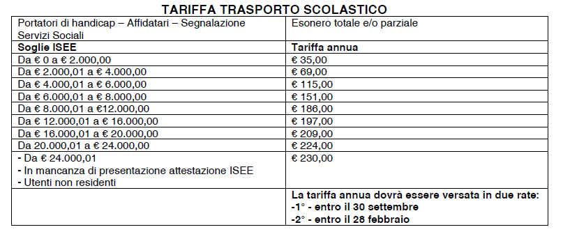 Con effetto dall’anno scolastico 2025/26, in attuazione di quanto stabilito con Delibera G.C. 111 del 15/11/2024, è prevista una quota fissa annuale di iscrizione di € 40,00 per il servizio di refezione scolastica e una quota fissa annuale di € 40,00 per il servizio trasporto scolastico, entrambe da corrispondere in due rate: la prima entro il 30 Settembre 2025 e la seconda entro il 28 Febbraio 2026, come previsto dall’art. 12 del Regolamento per la gestione degli interventi per il diritto allo studio sopra richiamato.