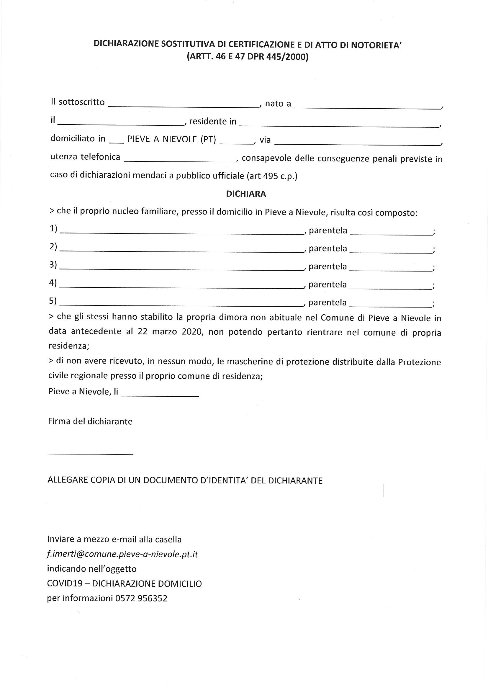 Per ottenerle, occorre inviare una e-mail a f.imerti@comune.pieve-a-nievole.pt.it indicando nome/cognome del richiedente, indirizzo ed un recapito telefonico, allegando una autocertificazione e copia del documento di identità, come da modello scaricabile qui.