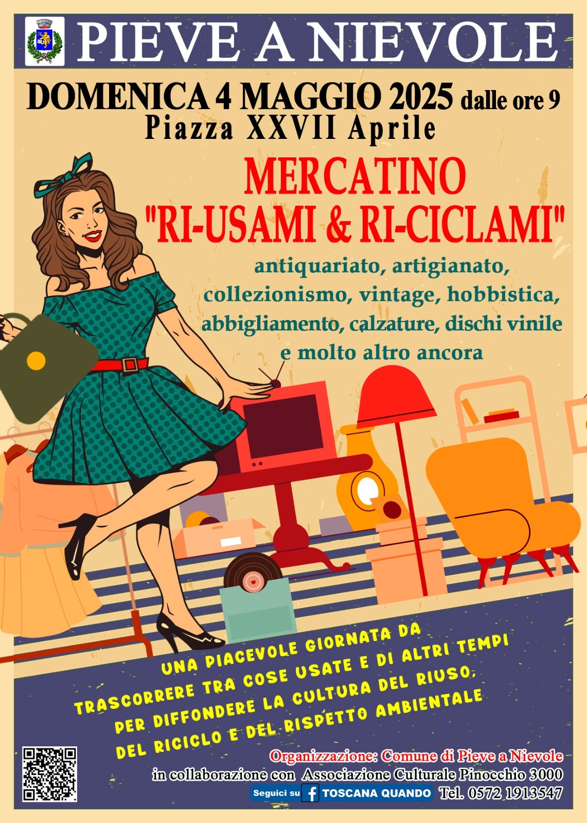 Domenica 4 maggio, piazza XXVII a Pieve a Nievole torna ad ospitare una nuova edizione del mercatino “RI-USAMI e RI-CICLAMI” voluto dall'Amministrazione Comunale e prodotto dall'associazione culturale Pinocchio 3000 che si pone lo scopo di diventare un punto di riferimento mensile, sempre alla prima domenica, per tutti gli appassionati del settore.
