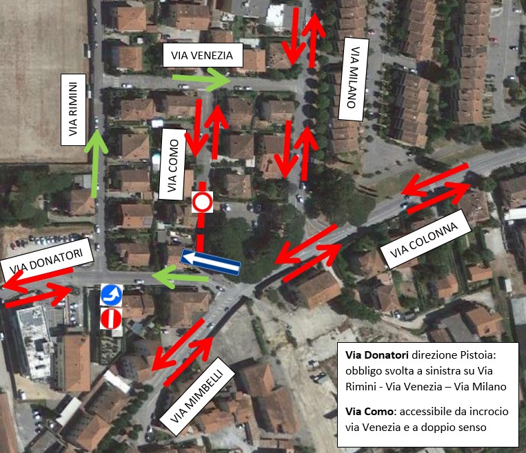 - istituzione di senso unico permanente in Via Donatori del Sangue, nel tratto tra Via Mimbelli e Via Rimini, in direzione da est verso ovest; pertanto per i veicoli in direzione verso est (verso Pistoia) deviazione su Via Rimini / Venezia / Milano;