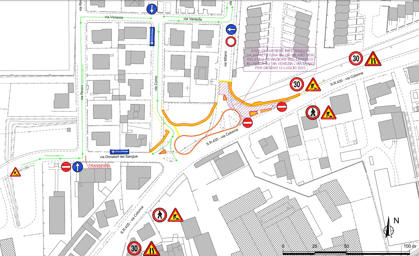 - per accedere in Via Milano, il percorso di deviazione è da Via Donatori del Sangue - Via Rimini - Via Venezia