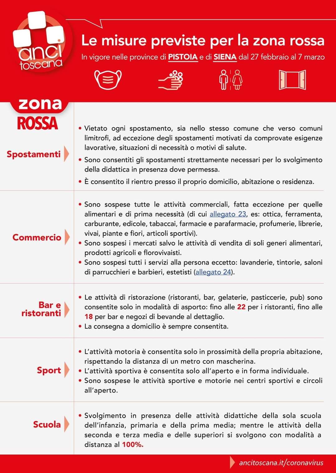 Si pubblica in allegato l'Ordinanza n. 6 del 26.02.2021 del Presidente della Giunta Regionale, Eugenio Giani, inerente il passaggio dei Comuni della Provincia di Pistoia a zona "rossa" dal 27 febbraio al 7 marzo 2021 compresi.