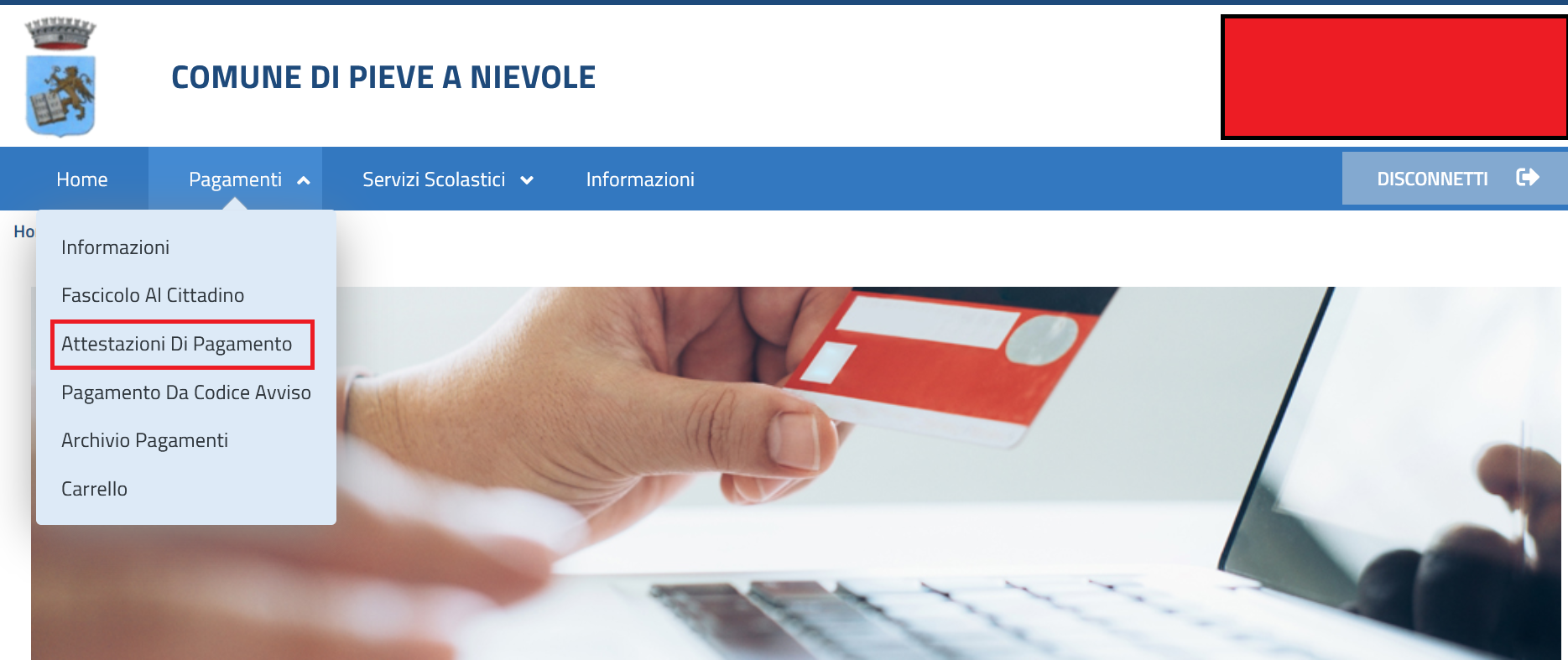 Cliccare sulla voce “attestazioni di pagamento” presente sul menù a tendina sotto alla voce “Pagamenti”