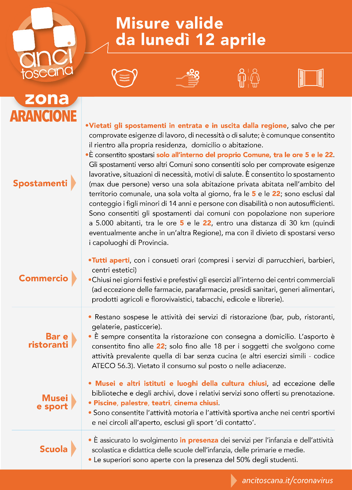 scheda sulle misure di contrasto e contenimento dell'emergenza Covid-19 previste per la zona arancione, valide a partire da lunedì 12 aprile