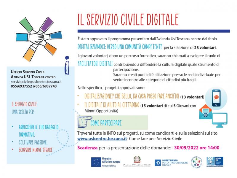 Link utile: https://www.uslcentro.toscana.it/index.php/solidarieta-e-cooperazione/570-servizio-civile/34470-servizio-civile-universale-bandi-progetti-selezioni-e-graduatorie-2 servizio_civile_facilitatori_digitali_uv.pdf (341,06 KB) Digitalizzazione_-_Che_bello,_da_casa_posso_fare_anchio!.pdf (450,53 KB) IL_DIGITALE_DI_AIUTO_AL_CITTADINO.pdf (467,43 KB)