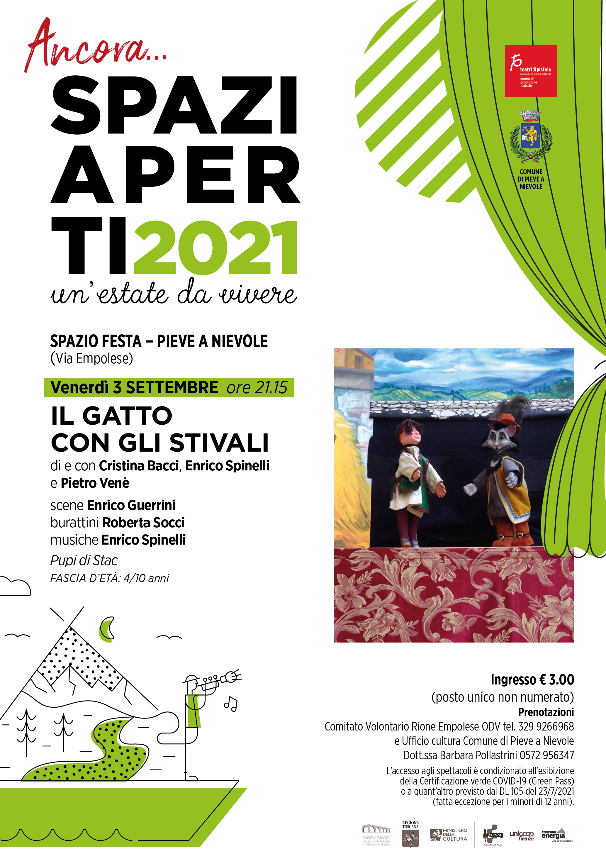 A Pieve a Nievole, venerdì 3 settembre alle ore 21,15, allo Spazio Festa di Via Empolese, è in programma lo spettacolo per bambini dai 4 ai 10 anni "Il gatto con gli stivali"; l'ingresso è di € 3,00 (posto unico non numerato), su prenotazione presso: