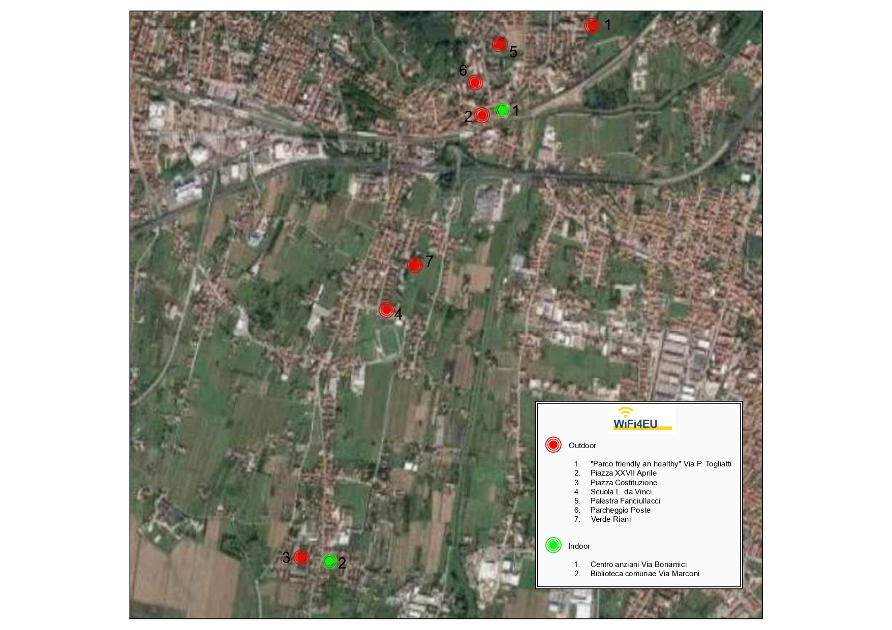Grazie al contributo assegnato al nostro Comune di 15.000,00 Euro, il progetto ha permesso l’installazione di hot-spot WiFi nei seguenti punti del territorio comunale (vedi anche la mappa in basso):
